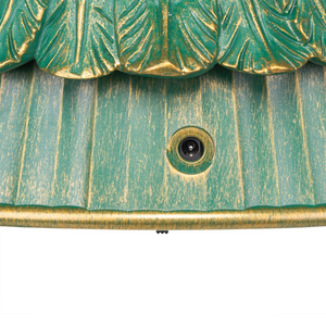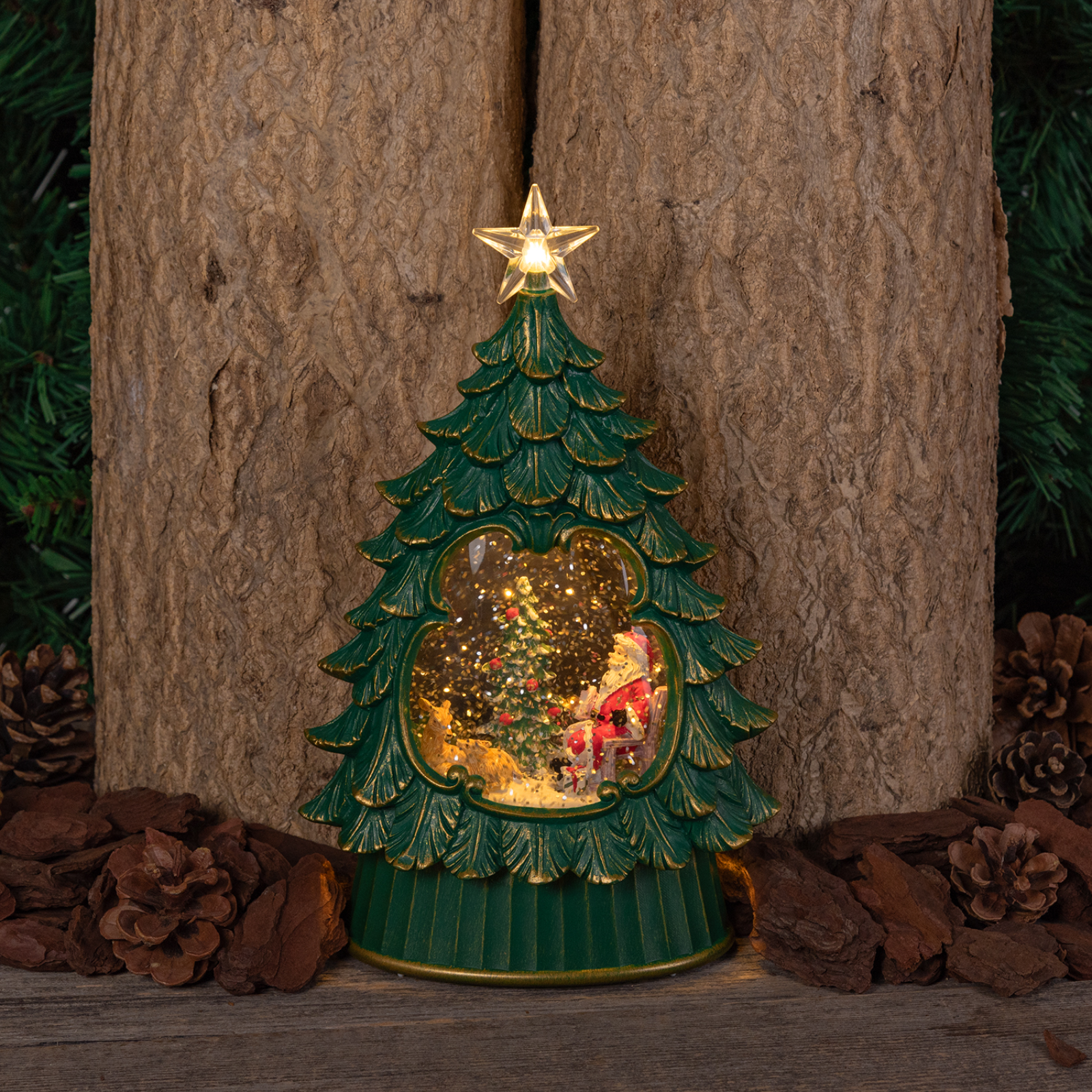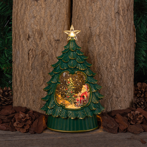 Realizzato in plastica verde antico con dettagli dorati, dispone di LED bianco caldo e glitter scintillanti che si illuminano creando un effetto magico in movimento. Include musica natalizia con 8 motivi ripetuti, selezionabile tramite interruttore, ed è alimentato a batteria (3xAA) con possibilità di collegamento a trasformatore opzionale. Portatile e pratico, è pensato per uso interno (IP20) e facile da collocare in ogni ambiente.