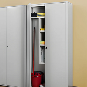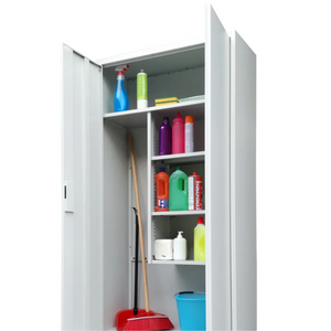Fornito smontato per un trasporto e un'installazione più agevoli, l'armadio è dotato di una serratura per garantire la sicurezza del contenuto. Le due ante si aprono su uno spazio interno ben organizzato, con quattro ripiani regolabili che offrono la possibilità di adattare lo spazio a varie esigenze, come scope, detersivi, attrezzature per la pulizia e altri accessori.