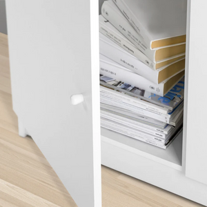 Il mobile multiuso basso è un versatile elemento d'arredo realizzato in legno bianco laccato, con uno spessore di 16 mm, pensato per offrire ampio spazio di archiviazione in un design compatto.