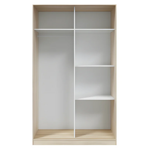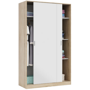 L'abbinamento di finiture rovere e bianco conferisce all'armadio un aspetto sobrio e raffinato, facilmente integrabile in vari stili d'arredo.