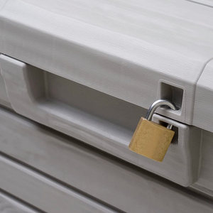Inoltre, il baule contenitore "Canada" è dotato di una finitura doghe che riproduce in modo realistico l'aspetto del legno. Questo effetto legno aggiunge un tocco di calore e naturalezza all'ambiente circostante, senza richiedere la manutenzione necessaria per il legno vero, come verniciature o trattamenti speciali.