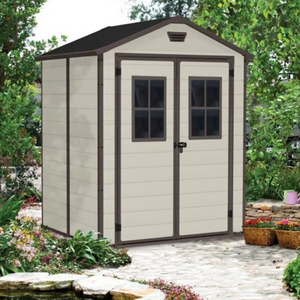 Casetta da giardino Manor, realizzata in resina beige con dettagli marroni e una raffinata finitura effetto legno graffiato.