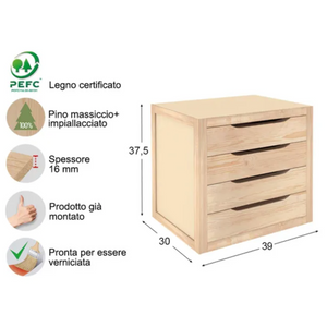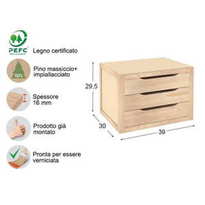 La cassettiera "Pino" portaoggetti costituita interamente in legno verniciabile è il complemento d'arredo ideale per riorganizzare i documenti o gli oggetti di una scrivania oppure grazie al suo design basic personalizzabile può essere utilizzata come soluzione portaoggetti in camera da letto o ripostiglio.
