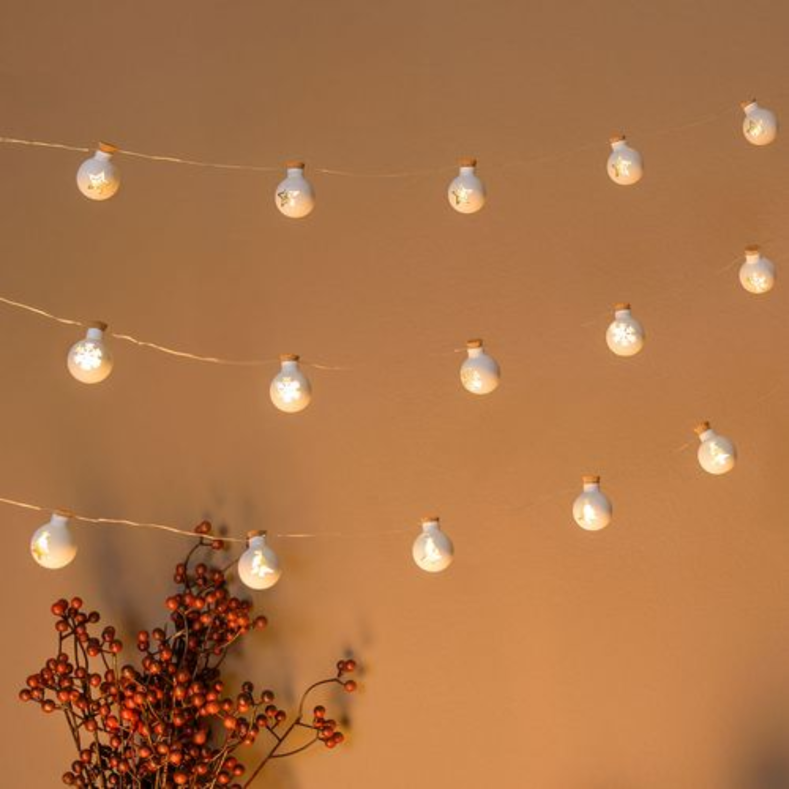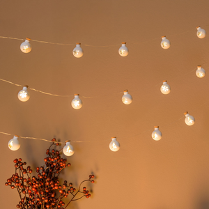 La catena lineare decorativa con 12 sfere in vetro bianco opaco è perfetta per aggiungere un tocco festivo agli ambienti interni. Ogni sfera da ø25 mm è arricchita da 12 MicroLED bianco caldo, offrendo un’illuminazione elegante e uniforme.