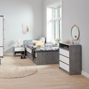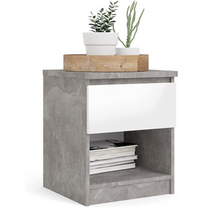 La superficie color cemento e i dettagli bianchi, conferiscono al comodino "Mina" un aspetto contemporaneo e di tendenza. Questa combinazione di colori neutri si adatta facilmente a diversi stili di arredamento, aggiungendo un tocco di modernità alla tua camera da letto.