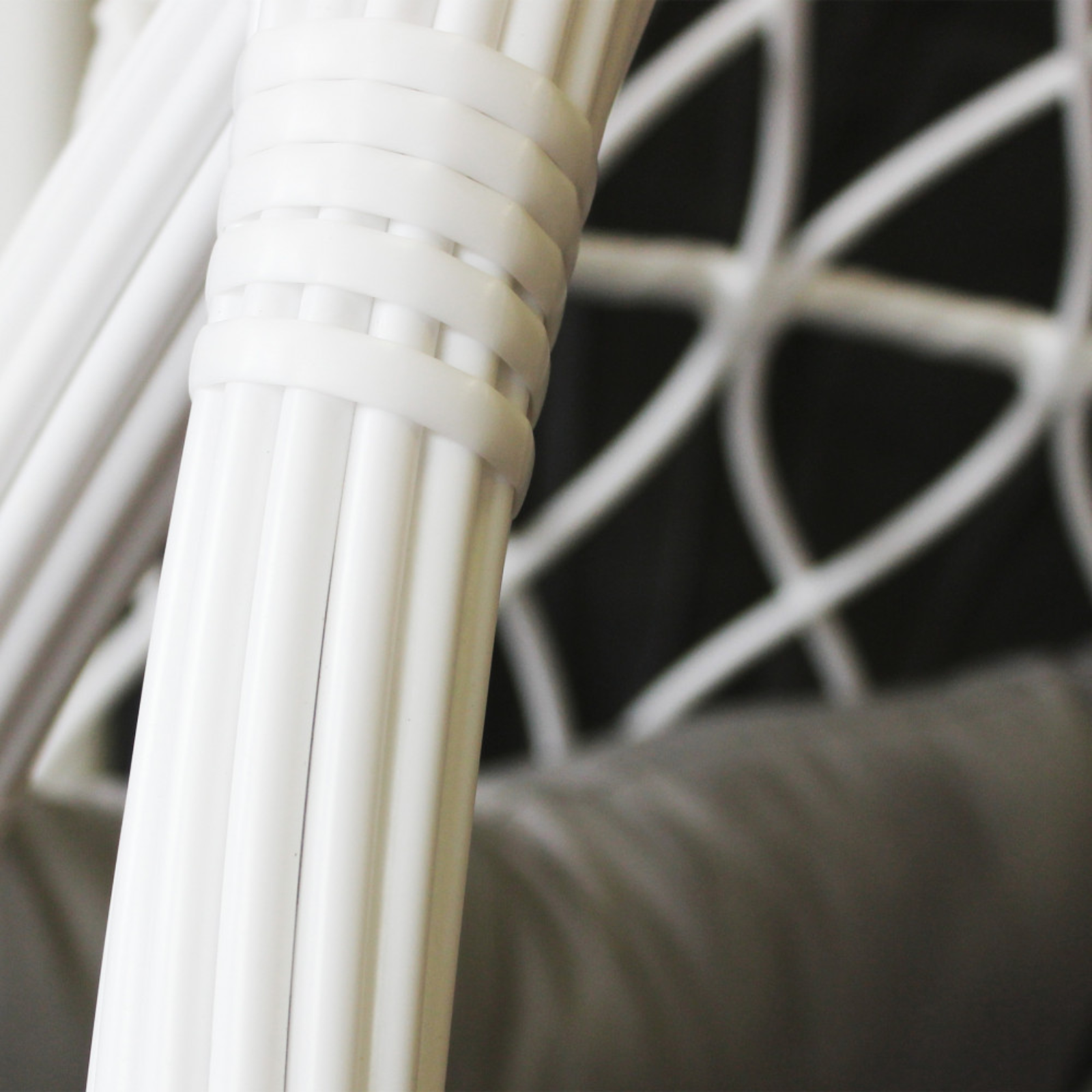La solida struttura in metallo assicura stabilità e resistenza, mentre la seduta in wicker, disponibile nella finitura bianca o naturale, dona un aspetto raffinato e accogliente.