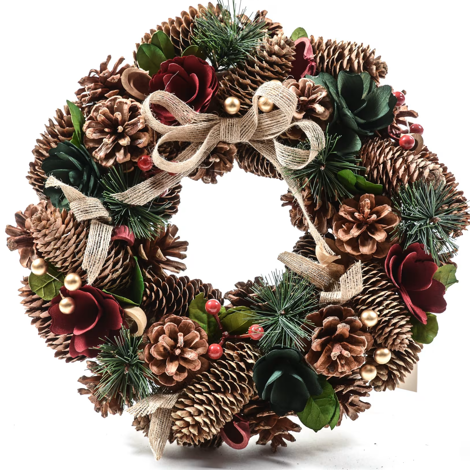 Ghirlanda dietro porta con pigne e fiore decorazione natalizia