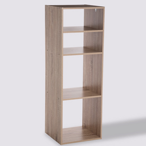 La libreria salvaspazio Modul a 4 scomparti unisce funzionalità e design moderno. Realizzata in legno con finitura effetto rovere naturale, è perfetta per organizzare libri, oggetti decorativi e accessori in modo ordinato ed elegante.
