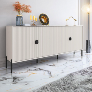 La madia da soggiorno Lotu si presenta in un sofisticato colore cashmere opaco, caratterizzata da un elegante frontale cannettato che aggiunge un tocco di raffinatezza al design.