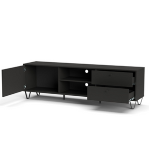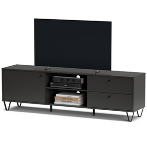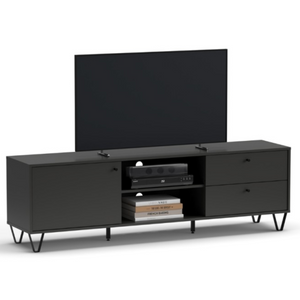 Dotato di due ampi cassetti, offre un'eccellente capacità di organizzazione per riporre telecomandi, cavi e altri accessori, mantenendo l'area intorno alla TV sempre in ordine. L'anta apribile nasconde ulteriori spazi per l'archiviazione discreta, mentre i due vani a giorno sono ideali per posizionare dispositivi elettronici come lettori DVD, console di gioco o decoder, garantendo facile accesso e ventilazione.