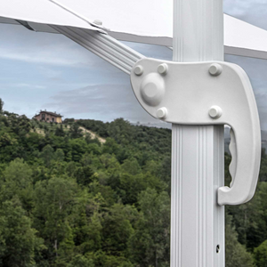 L'ombrellone è dotato di un camino di ventilazione, che permette il passaggio dell'aria, riducendo la resistenza al vento e migliorando la stabilità complessiva. La base in acciaio è equipaggiata con un meccanismo di rotazione a 360 gradi, permettendo di orientare facilmente l'ombrellone nella direzione desiderata per una copertura ottimale.