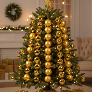 Il set da 24 palline per albero di Natale oro lucido e opaco è la soluzione ideale per chi desidera un’illuminazione calda ed elegante durante le feste. Con un diametro di 6 cm, queste palline combinano la brillantezza della finitura lucida con la raffinatezza dell’effetto opaco, creando un mix armonioso e sofisticato.