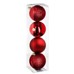 Il set da 4 palline natalizie Ø 8 cm unisce eleganza e versatilità per un albero raffinato e luminoso. Ogni confezione include palline assortite nei colori rosso, champagne e bianco, con finiture sia lucide che opache, per un effetto decorativo armonioso e variegato.