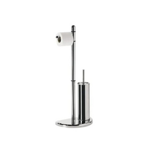 La piantana Scum unisce funzionalità e stile in un unico accessorio compatto, perfetto per ottimizzare lo spazio in bagno. Realizzata in metallo cromato lucido, è composta da un portarotolo per carta igienica e un portascopino con setole, integrati su una base semicircolare che permette una facile collocazione anche negli angoli o a ridosso del muro.