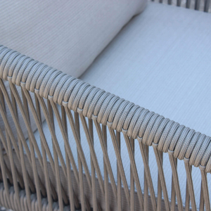 La struttura in alluminio verniciata a polvere color grigio garantisce leggerezza, stabilità e un’ottima resistenza agli agenti atmosferici. Braccioli e schienali rivestiti in corda tonda sintetica aggiungono un tocco elegante e raffinato, assicurando al tempo stesso comfort e durata nel tempo.