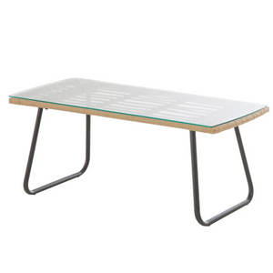 Il tavolino rettangolare incluso nel set ha un piano in vetro temperato. Il vetro temperato è un materiale sicuro e resistente agli urti, che resiste bene alle temperature estreme e alle intemperie. Il piano in vetro offre un aspetto elegante e permette di appoggiare bicchieri, piatti o oggetti decorativi in modo sicuro.
