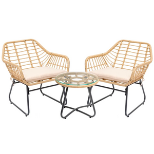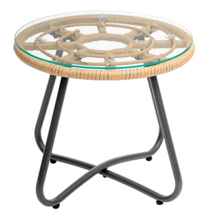 Il tavolino rotondo incluso nel set ha un piano in vetro temperato. Il vetro temperato è un materiale sicuro e resistente agli urti, che resiste bene alle temperature estreme e alle intemperie. Il piano in vetro offre un aspetto elegante e permette di appoggiare bicchieri, piatti o oggetti decorativi in modo sicuro.