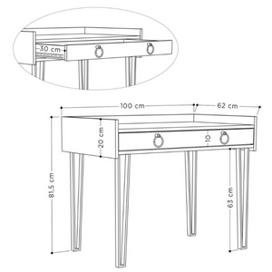 È dotata di un pratico cassetto con due maniglie in metallo, ideale per riporre documenti e utensili da scrittura. Le quattro gambe in metallo, alte 63 cm, assicurano stabilità e supportano un carico massimo di 50 kg, rendendo questa scrivania adatta a diverse esigenze lavorative.