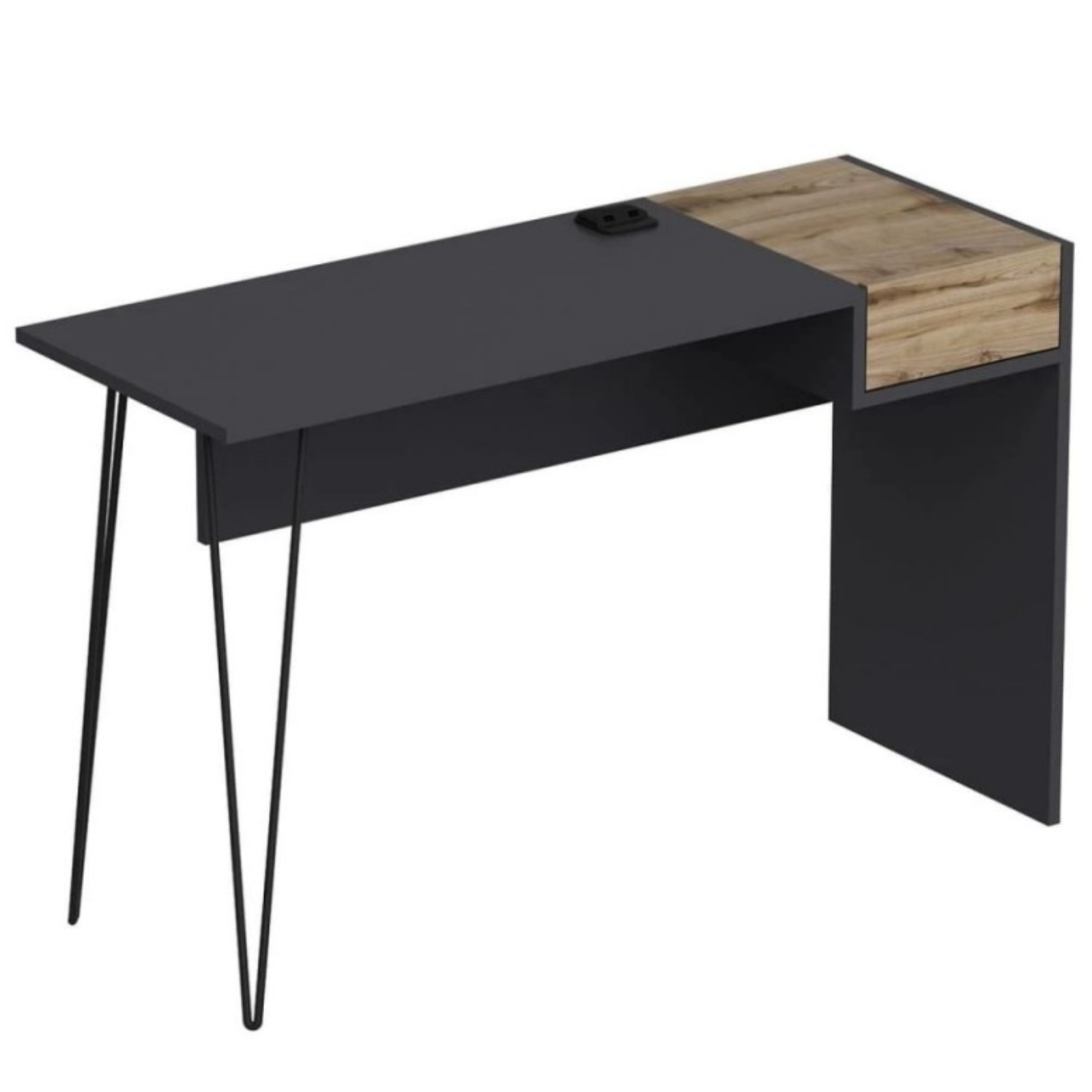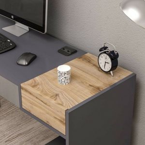 Il piano di lavoro in finitura antracite e noce offre una combinazione cromatica sofisticata che valorizza qualsiasi spazio, dal salotto all'ufficio.
