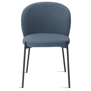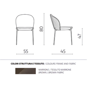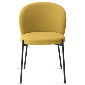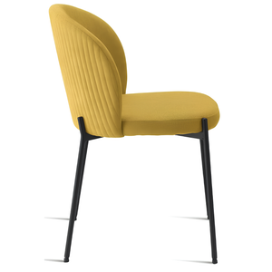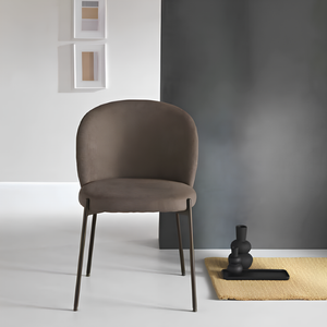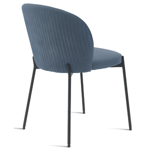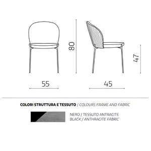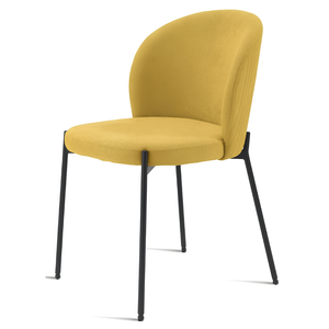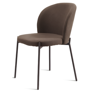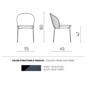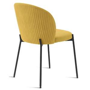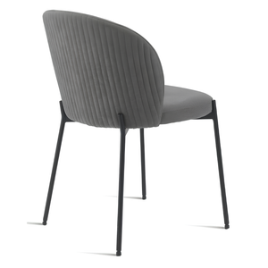 La seduta e lo schienale sono rivestiti in tessuto imbottito, offrendo un supporto confortevole e una sensazione di morbidezza. La struttura in metallo verniciato garantisce robustezza e stabilità, aggiungendo un tocco di modernità.