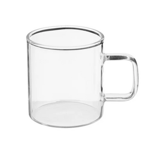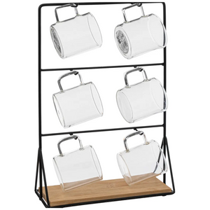 Le tazzine in vetro trasparente esaltano l’aroma e il colore del caffè, mentre il supporto in metallo con base in legno garantisce ordine e un tocco di stile raffinato.