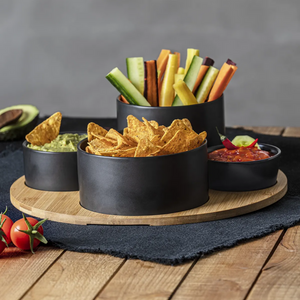 Il Set Aperitivo 4 pz in Plastica con Supporto in Bambù è la soluzione perfetta per servire snack, salse e antipasti con praticità e stile.