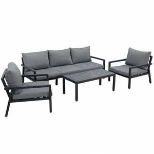 Composto da un divano a tre posti, due poltrone singole e un tavolino coordinato, offre spazio per quattro persone.