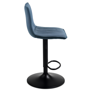 Lo sgabello da cucina Kole, dal design moderno, presenta una seduta in tessuto blu imbottito che assicura comfort e un aspetto sofisticato.