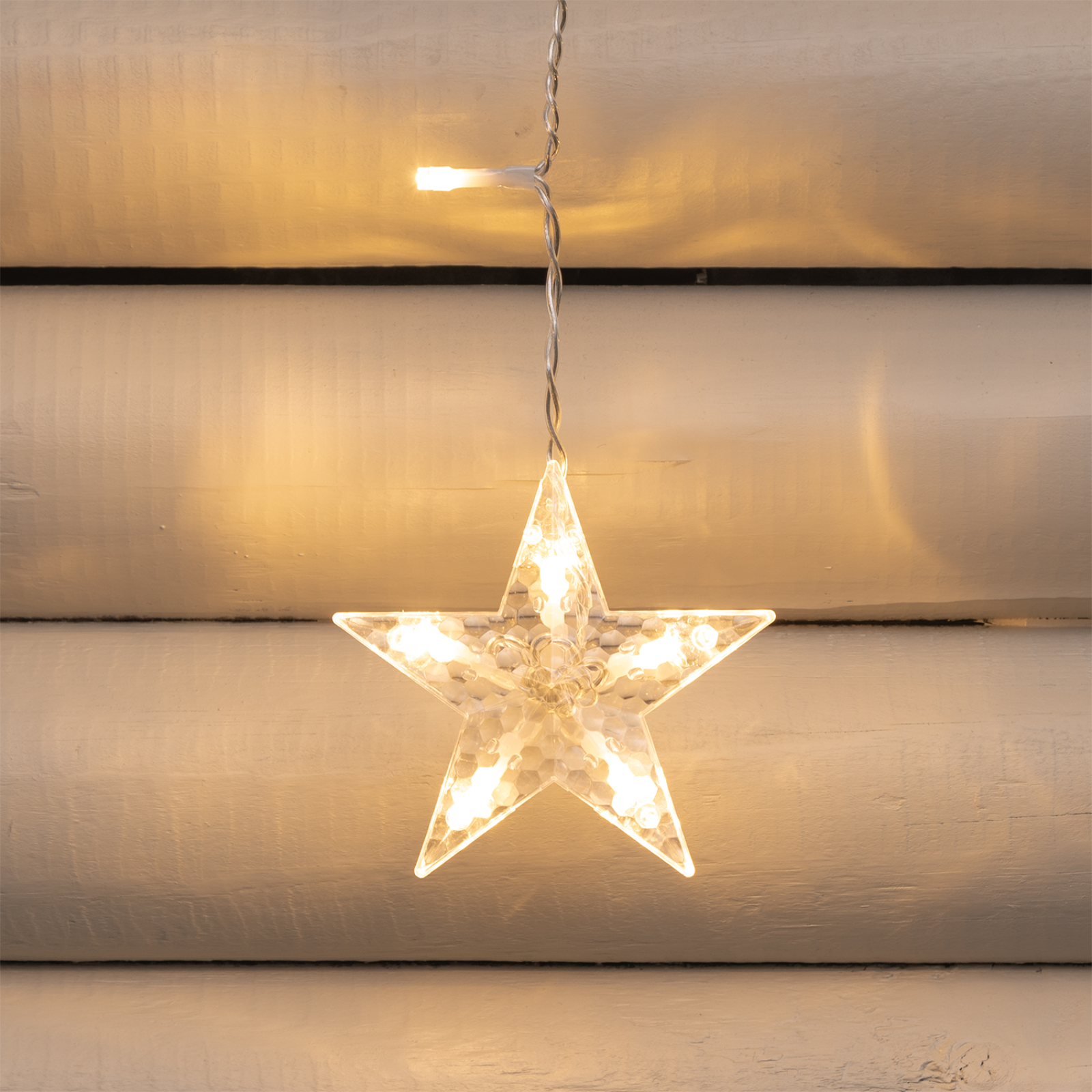 La Ice Star Light è una decorazione luminosa natalizia caratterizzata da 10 stelle luminose distribuite su stringhe con 90 LED bianco caldo. Il design elegante con cavo trasparente la rende adatta a qualsiasi ambiente e stile di arredamento.