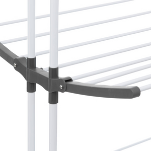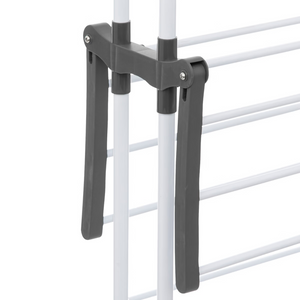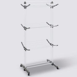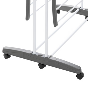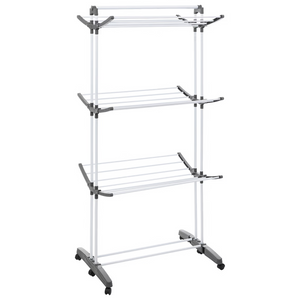 Dotato di ripiani regolabili, barra telescopica allungabile e ruote in plastica per un facile spostamento, questo stendibiancheria è perfetto per un utilizzo in ambienti interni.