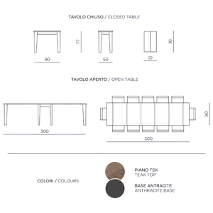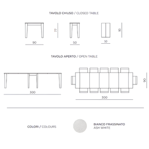 Realizzato in legno, questo tavolo può essere esteso da una lunghezza di 90 cm fino a 300 cm, permettendo di ospitare comodamente fino a 12 persone.