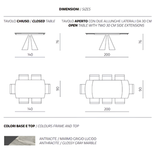 Il tavolo dispone di due allunghe laterali da 30 cm ciascuna, che permettono di estenderlo da 140 cm a 200 cm, adattandosi facilmente a diverse esigenze di spazio e ospitalità.